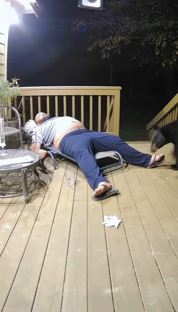 자는 사람 위로 올라간 곰